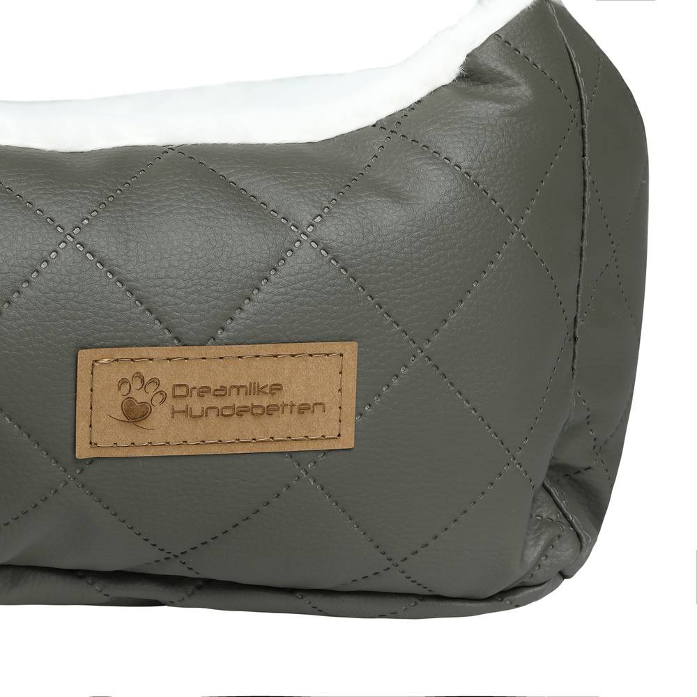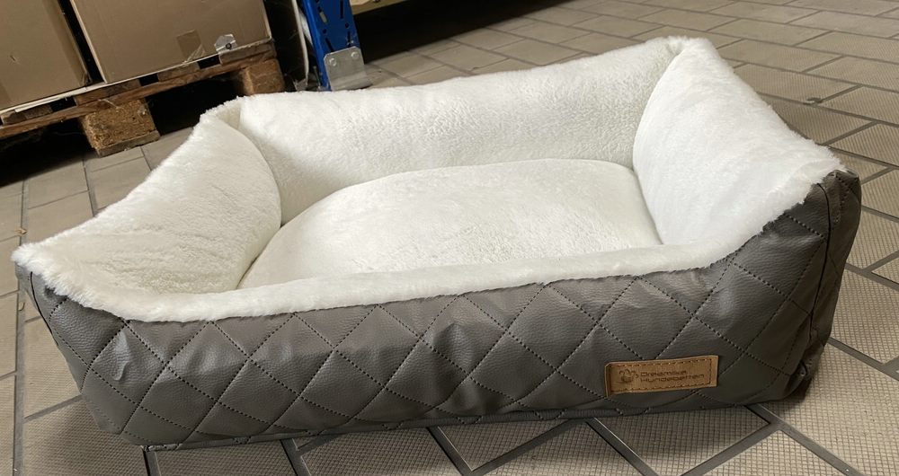 gemütliches Hundebett aus robustem Kunstleder und kuscheligem Plüsch, neu und ungenutzt. Der Bezug hat einen Reißverschluss und kann komplett in der Waschmaschine gewaschen werden. Sehr stabile, feste, langlebige Qualität. Farbe Kunstleder dunkles taupe, Plüsch helles creme