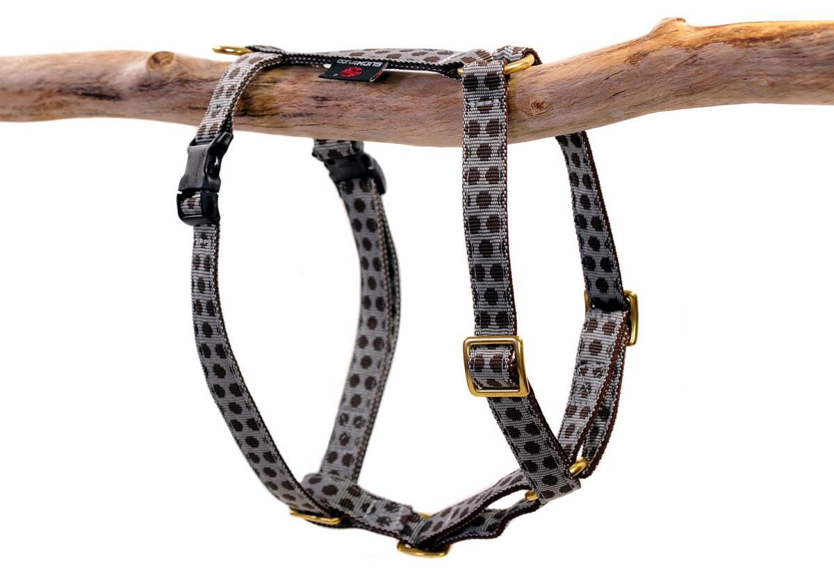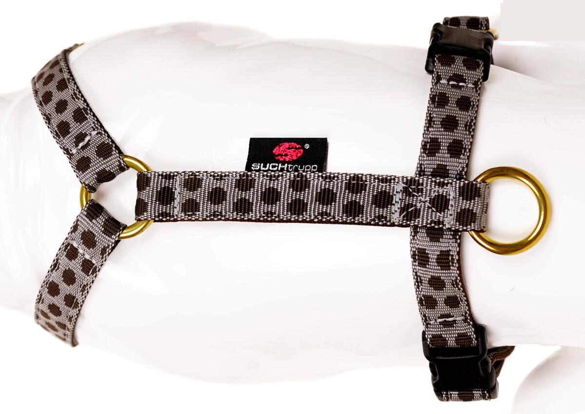 neues, ungenutztes Hundegeschirr von Suchtrupp, Modell Dots grey-brown mit goldenen Ringen und Schiebern. Gr. L