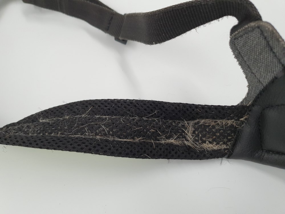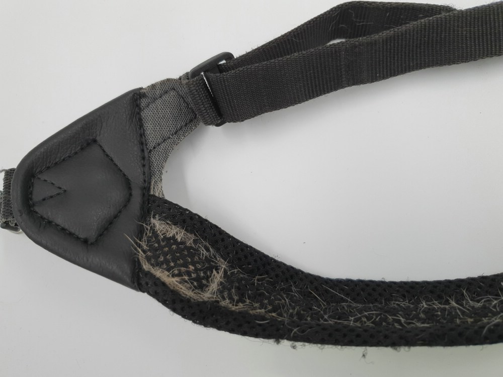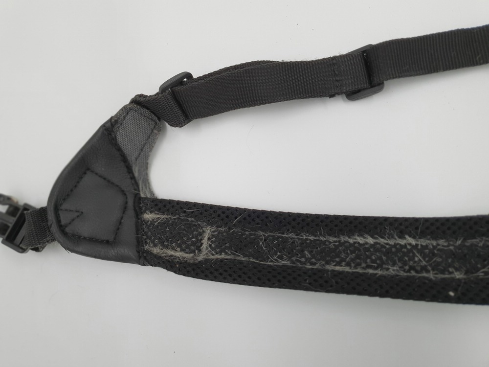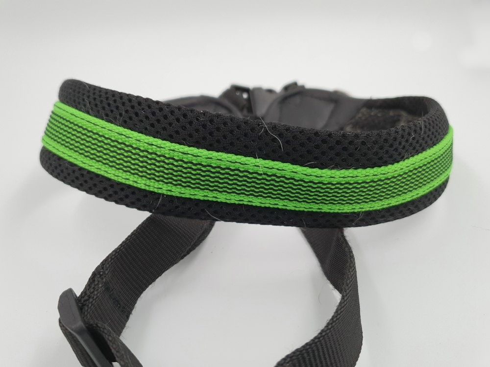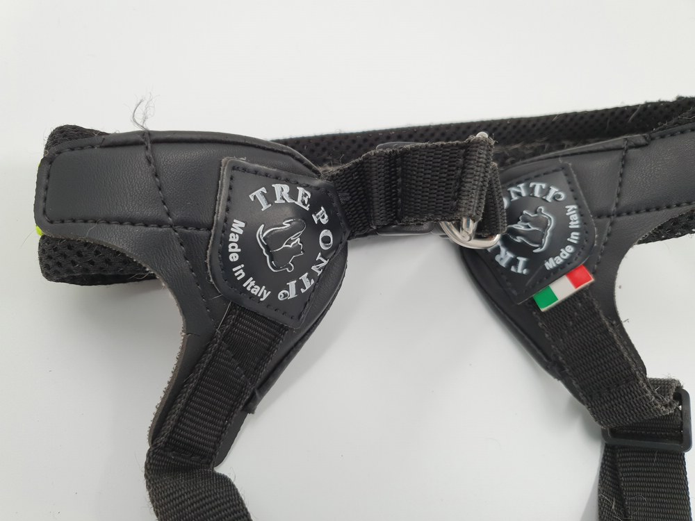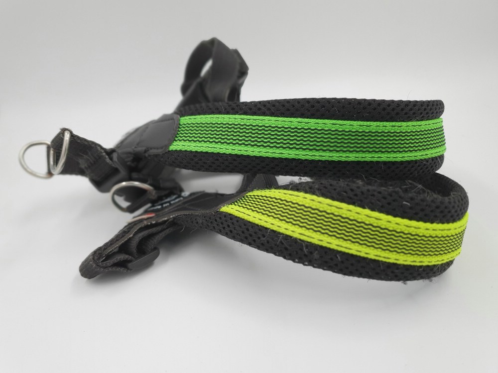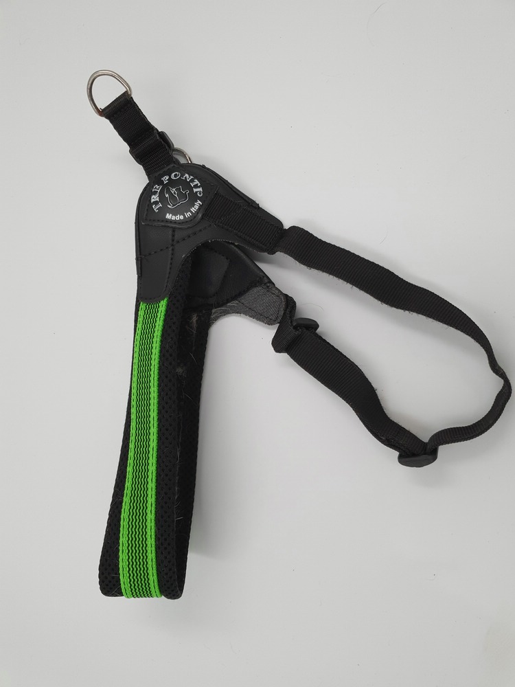Hundegeschirr Tres Ponti, schwarz-neon, Brustgurt nicht einstellbar ca 40 cm Länge; Bauchgurt verstellbar 30 - 40 cm, verschliessbar auf Schulter mit Klickverschluss, zwei Ringe zum Einhängen der Leine, viel Haare im Innenbereich (s. Bilder)