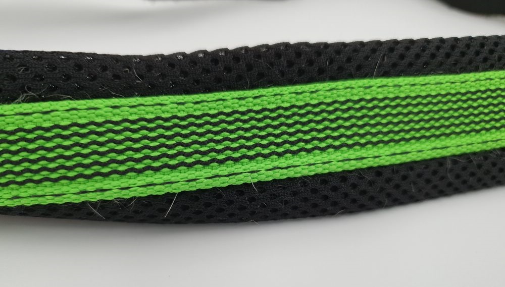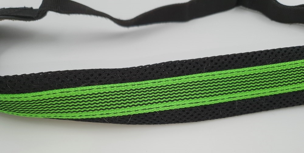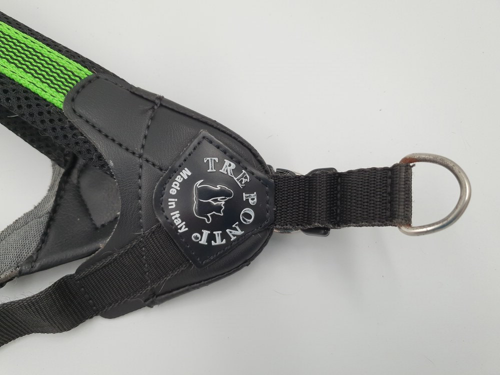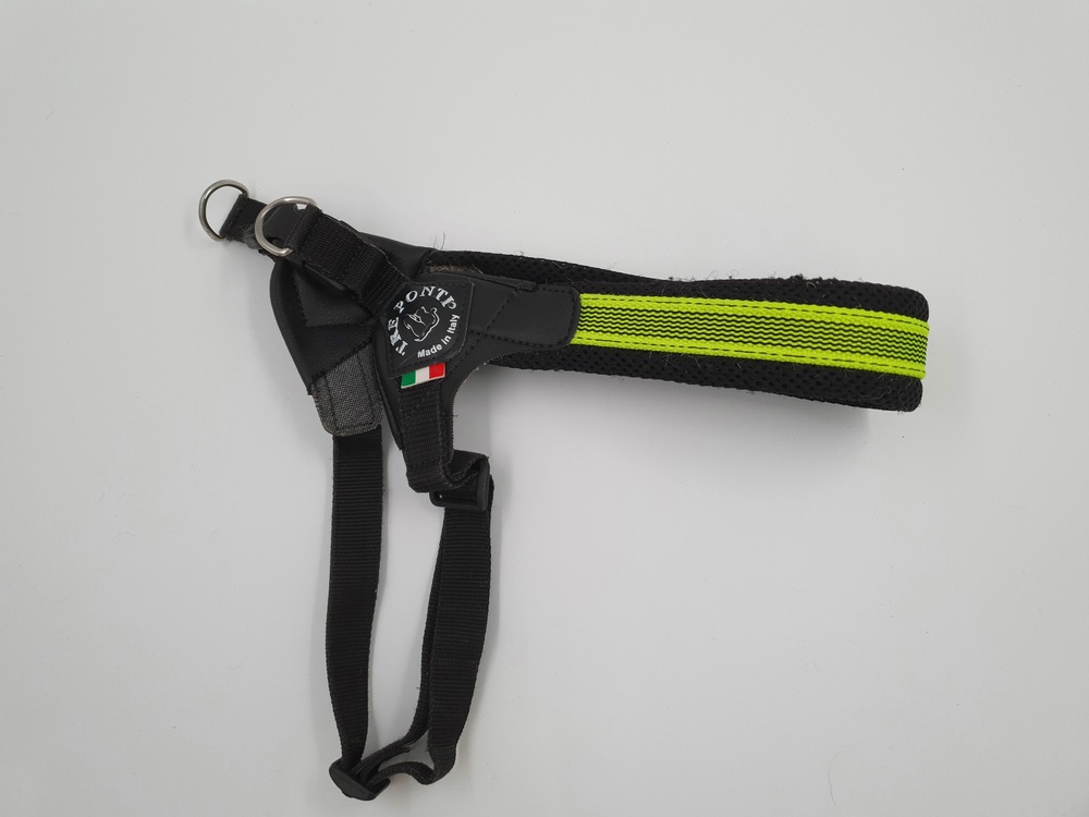 Hundegeschirr Tres Ponti, schwarz-neon, Brustgurt nicht einstellbar ca 40 cm Länge; Bauchgurt verstellbar 30 – 40 cm, verschliessbar auf Schulter mit Klickverschluss, zwei Ringe zum Einhängen der Leine, viel Haare im Innenbereich