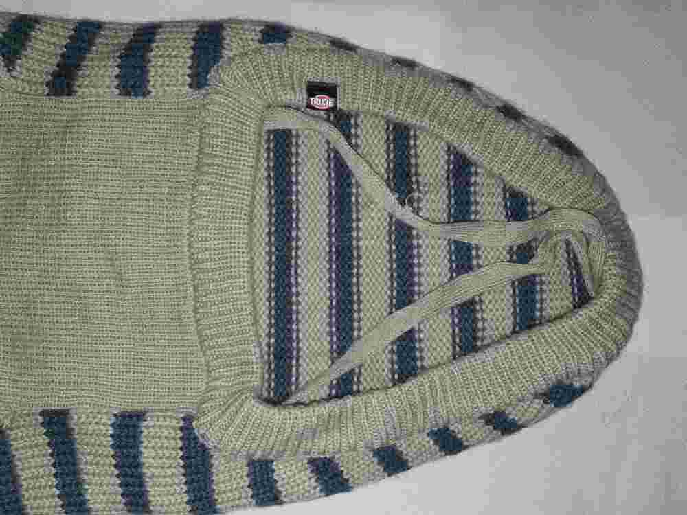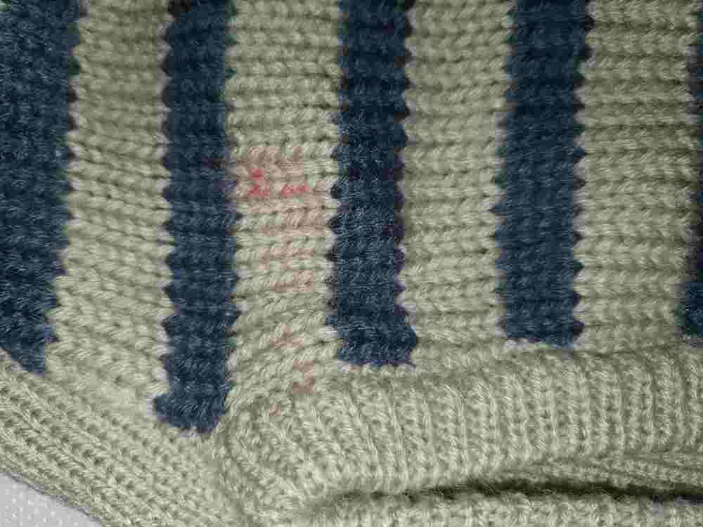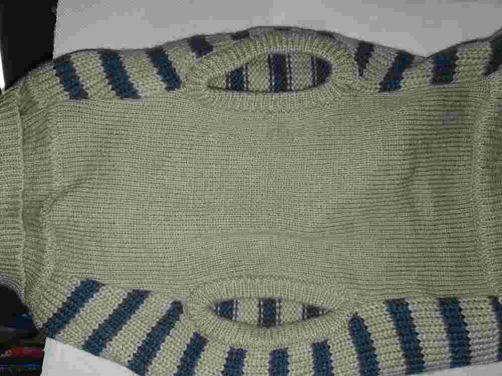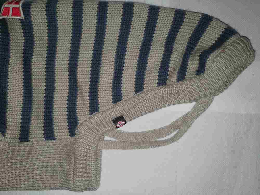 Hundepullover Trixie grau-blaue Streifen, Gr. 60 cm, Label auf dem Rücken, mit Kragen und Öffnung für das Halsband, Material 100 % Acryl, waschbar bei 30 Grad, leichte rote Verfärbung an der Beinöffnung vorne links (s. letztes Foto)