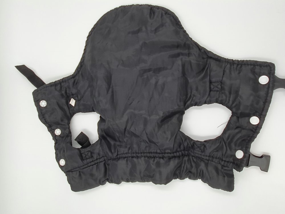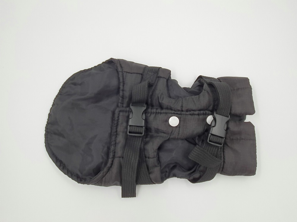 leichter, waschbarer Hundemantel mit integriertem Geschirr, schwarz, Gr. S Rückenlänge 26 cm, Brustumfang 43 cm, verschliessbar unter Brust/Bauch mit 3 weißen Druckknöpfen, Geschirr verschliessbar unter Brust/Bauch mit 2 Klickverschlüssen, Polyester
