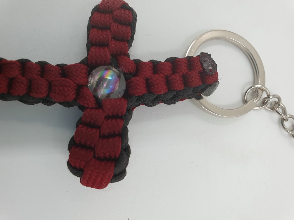Schlüsselanhänger Paracord Kreuz bordeaux-schwarz mit Perle, ca. 10 x 5 cm