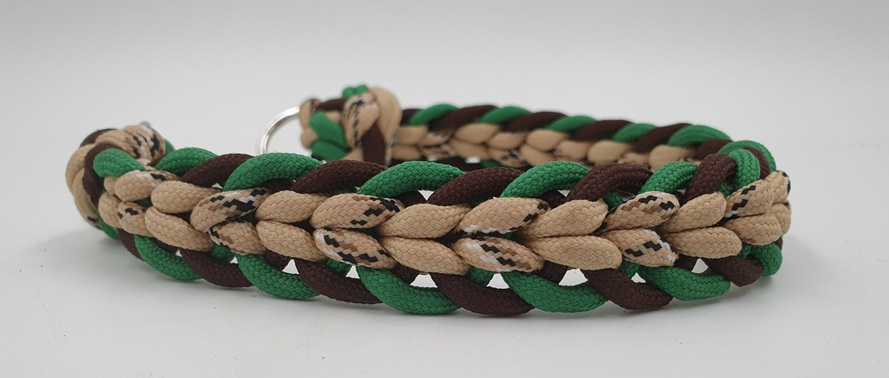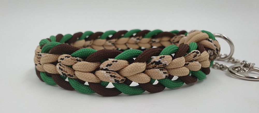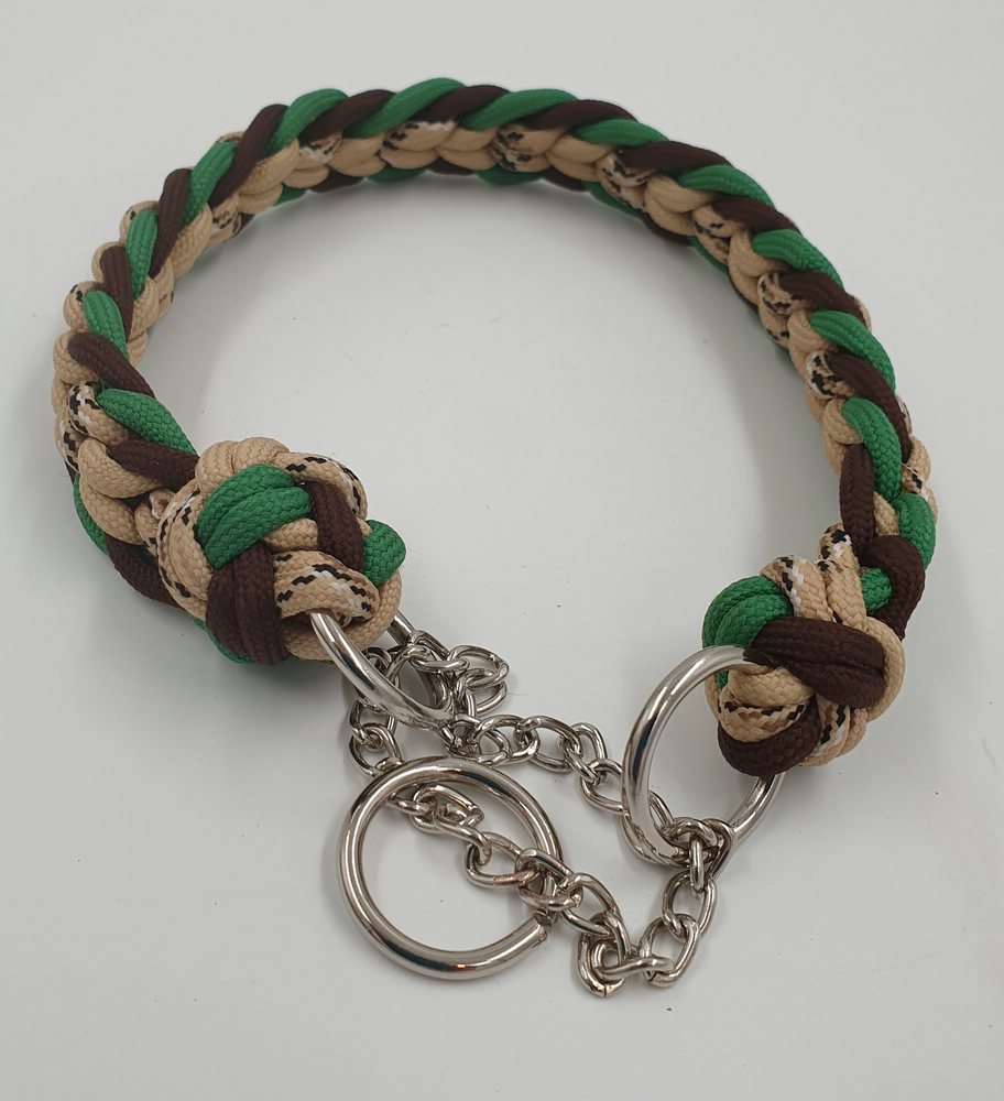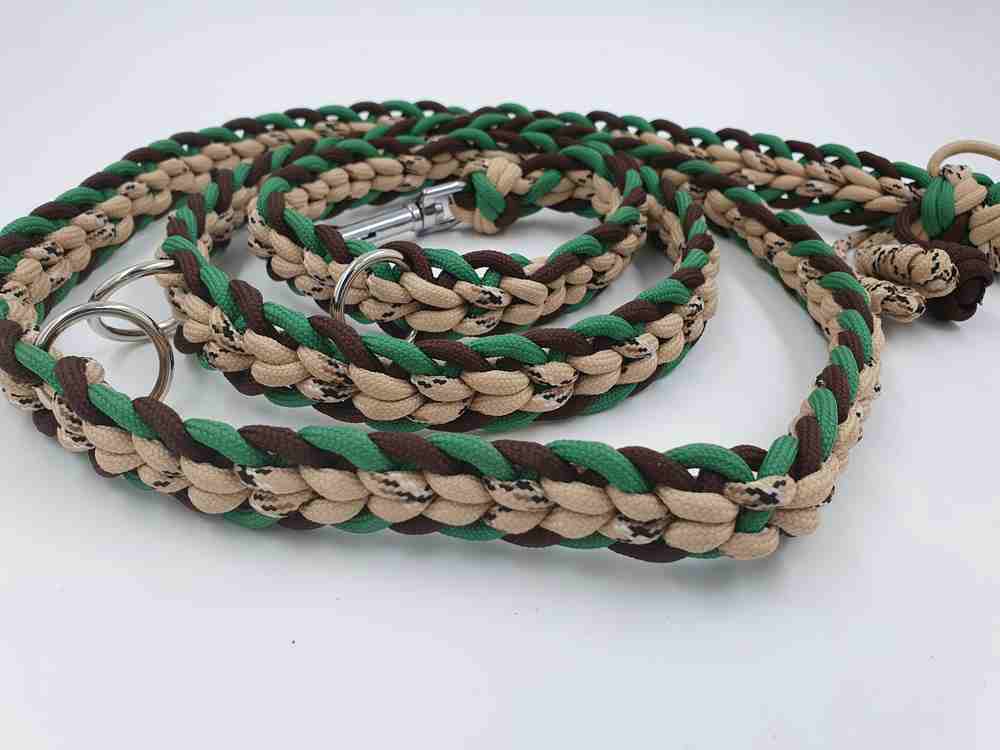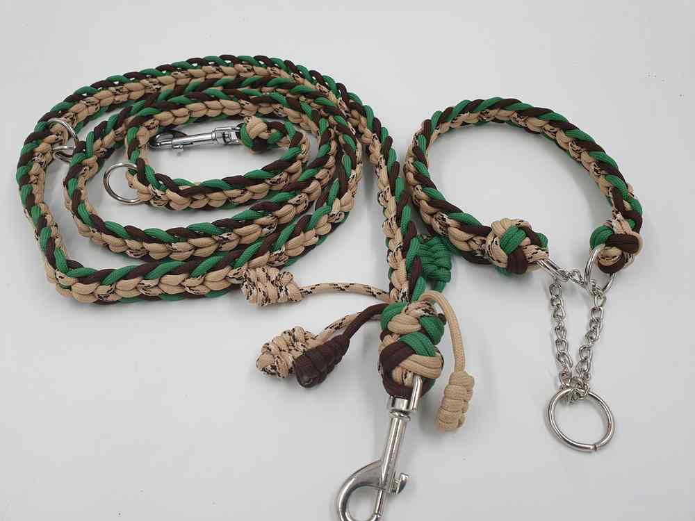 neues, ungenutzes Set aus Halsband mit Kettenzug und passender Leine aus Paracord. Das Halsband mit Kettenzug ist passend für einen Halsumfang von 34 – 36 cm und hat einen Durchmesser von ca 12 cm. Die 3-fach verstellbare Leine hat eine komplette Länge von 180 cm. Das Set ist 2 cm breit.