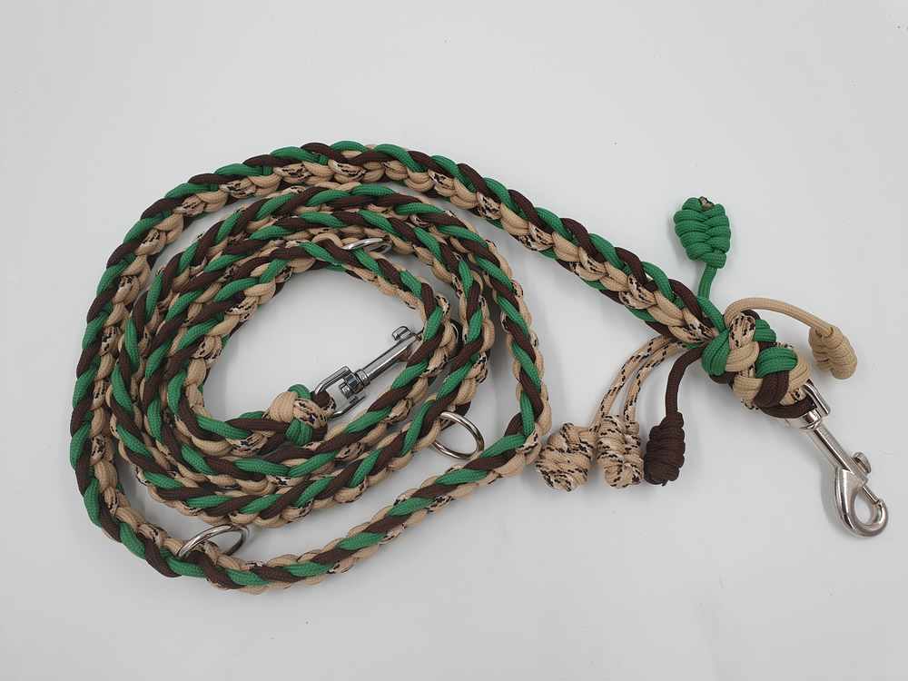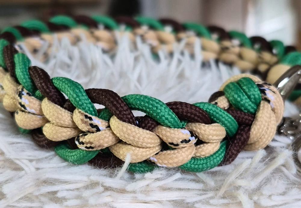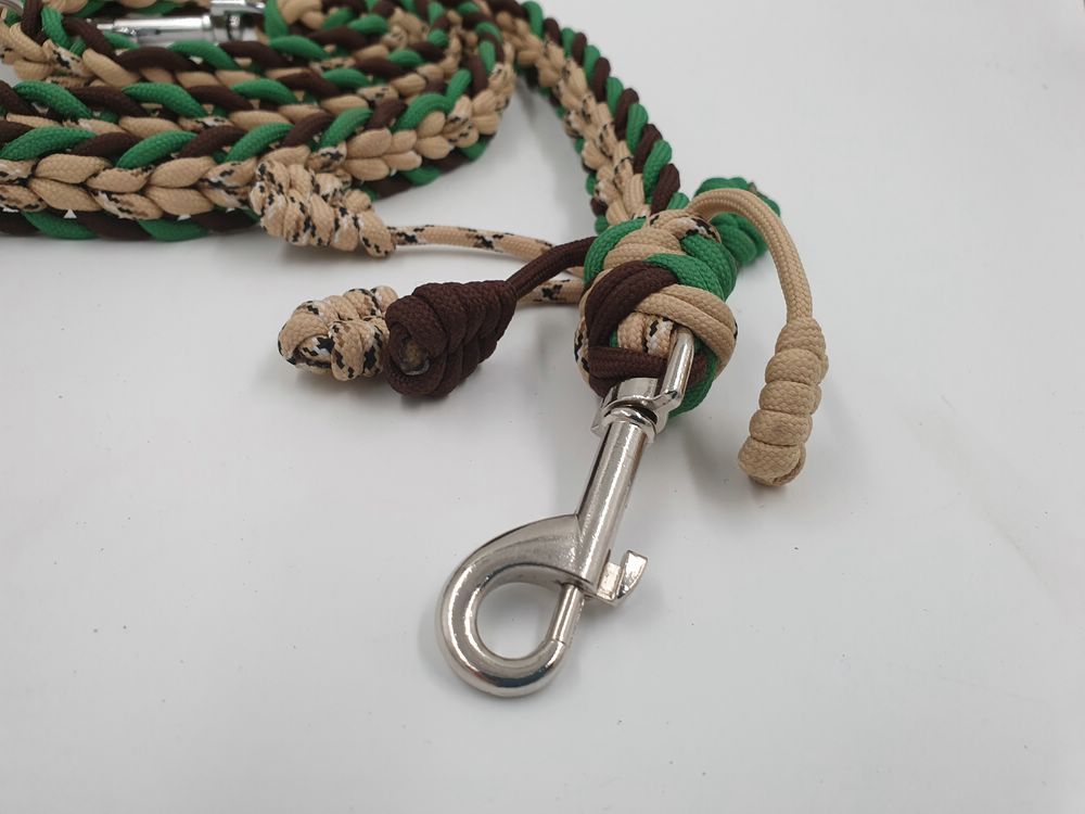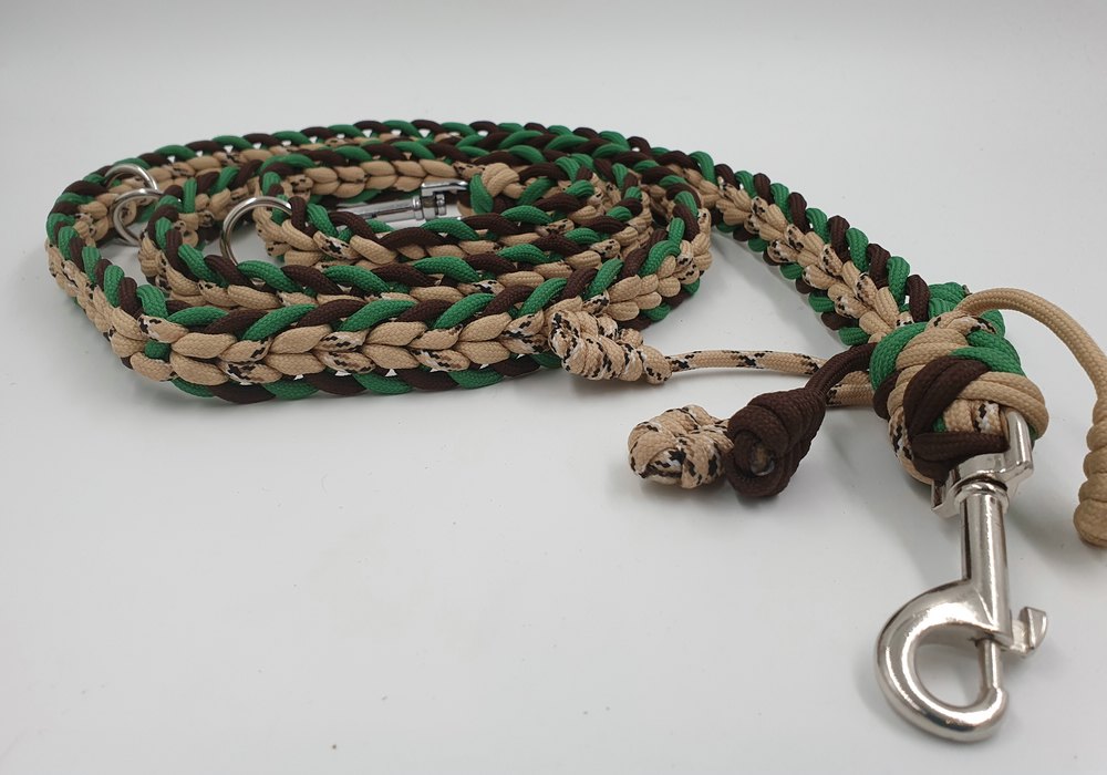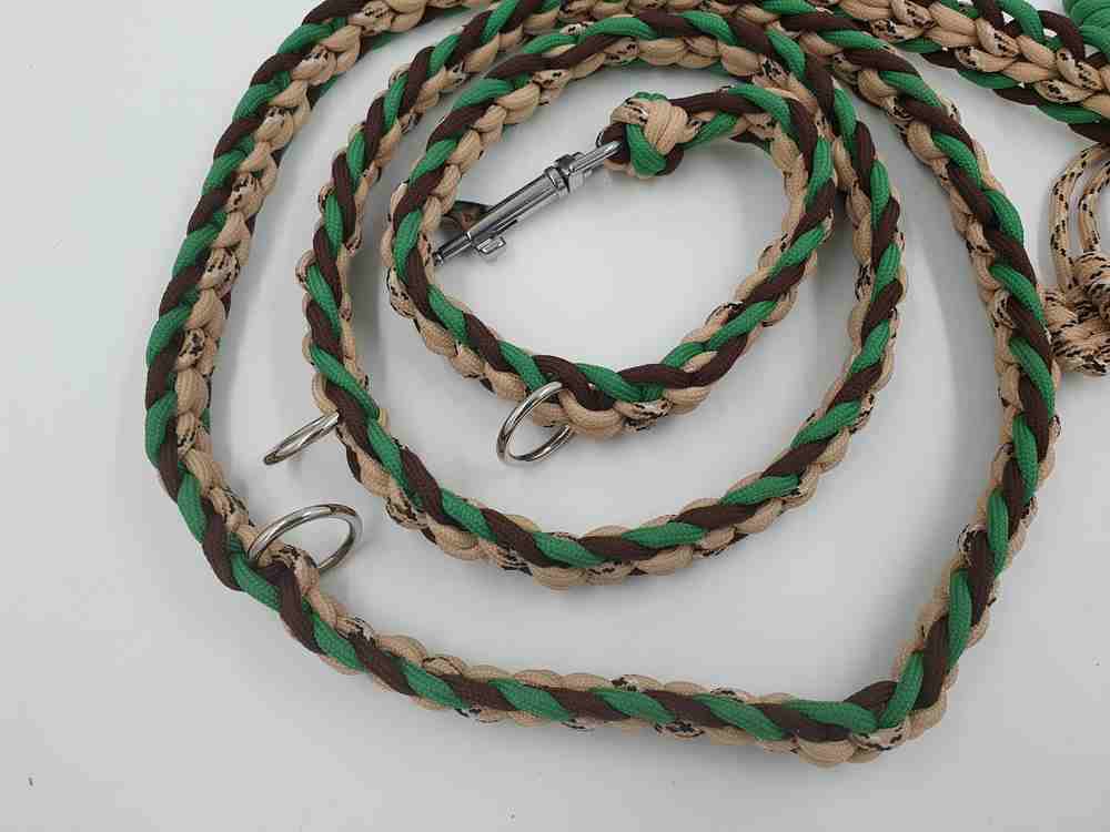 neues, ungenutzes Set aus Halsband mit Kettenzug und passender Leine aus Paracord. Das Halsband mit Kettenzug ist passend für einen Halsumfang von 34 – 36 cm und hat einen Durchmesser von ca 12 cm. Die 3-fach verstellbare Leine hat eine komplette Länge von 180 cm. Das Set ist 2 cm breit.