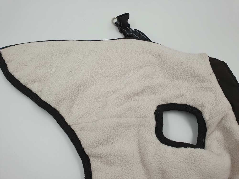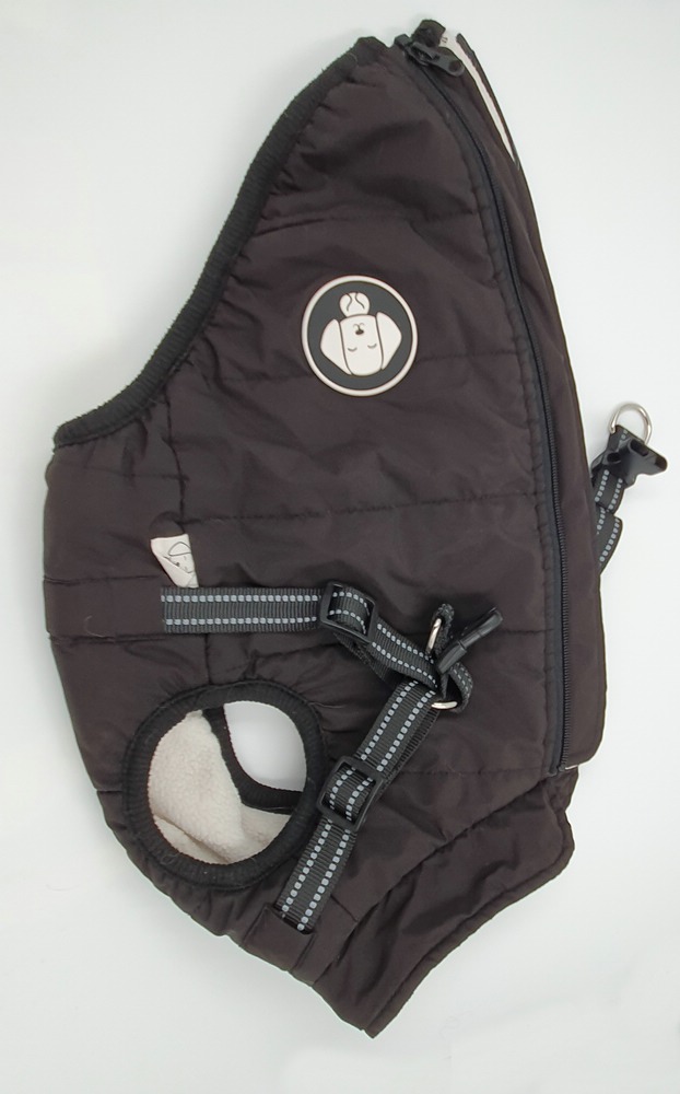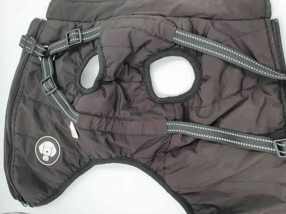 warmer, waschbarer Hundemantel mit integriertem Geschirr, schwarz, Gr. XL 6,5 – 9 kg, Brustumfang 51 cm, Rückenlänge 40 cm, wetterfest, Reißverschluss auf Rücken, Rückenlänge 40 cm, riecht auch nach Wäsche leicht muffig, neu und ungenutzt