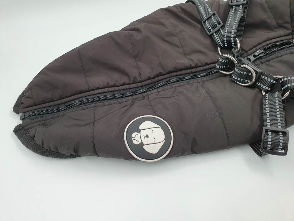 warmer, waschbarer Hundemantel mit integriertem Geschirr, schwarz, Gr. XL 6,5 - 9 kg, Brustumfang 51 cm, Rückenlänge 40 cm, wetterfest, Reißverschluss auf Rücken, Rückenlänge 40 cm, riecht auch nach Wäsche leicht muffig, neu und ungenutzt